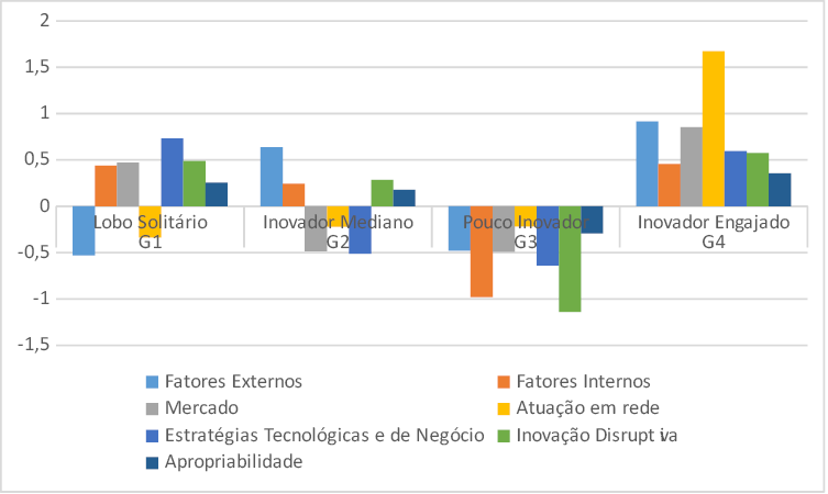 Os grupos foram identificados pela análise hierárquica de agrupamento (análise de cluster). Desse modo, identificaram-se quatro grupos semelhantes em sua formação, mas diferentes quanto à exploração dos fatores e à atuação para a inovação disruptiva. O grupo que mais se destacou por alcançar os melhores resultados foi denominado como inovador engajado. Ele recebeu essa denominação porque apresenta as maiores médias dos escores de quase todos os fatores, em especial nos fatores externos (compostos pelas políticas públicas e pelas estruturas de ensino/pesquisa) e na atuação em rede com outras firmas e instituições.