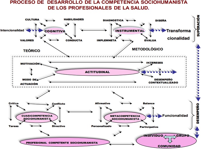 La competencia sociohumanista en el profesional de la salud se refiere a una coherente correspondencia en el desempeño sociohumano entre el modo de actuación con la vocación y la aptitud desarrolladas en el proceso de enseñanza aprendizaje que sustenta su formación como profesional de la salud, de forma tal que sus elementos esenciales se articulen en el efectivo servicio integral en el contexto del modelo de medicina social al que debe responder.