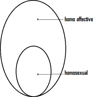 A questão central para o entendimento do dito movimento g0y é conseguir separar os conceitos de homo-sexual e de homo-afetivo - nesse caso as palavras compostas foram escritas com hífen apenas para dar a devida ênfase, pois este seria o cerne da questão. O termo homossexual remete ao ato sexual entre iguais, já o afeto remete a questões mais amplas que envolvem o carinho, o toque, o contato íntimo, etc. Esta interseção relacional entre conceitos ocorre conforme Figura 1.
