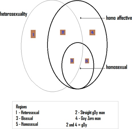 Dessa maneira, em acordo com o diagrama da figura 2, a ideia contemporânea e presente a partir dos preceitos g0ys, é que um homem heterossexual (ou às vezes não, já que um g0y também pode ser exclusivamente homo afetivo) pode manter relações eróticas ou contatos homos e não ser necessariamente gay, entendendo-se gay nesse contexto particular como sendo um homem que mantém relações de cópula com outro homem (penetração pênis-ânus).