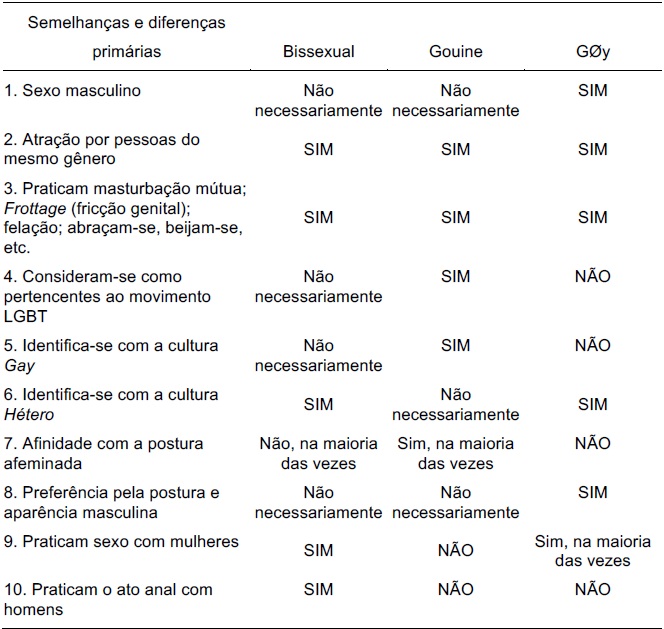 Nesse contexto, pela própria definição do termo gay, e a definição do termo g0y nota- se que um é diferente do outro, são conceitos não convergentes apesar de possuírem semelhanças no que se refere à orientação sexual – a homossexualidade, mas são totalmente diferentes no que se refere às posturas, às práticas e aos comportamentos homo masculinos apresentados. Esses conceitos são tão recentes que o próprio Direito possui entraves para reconhecimento e diferenciação entre união afetiva e união de reprodução sexualizada, conforme aborda Efrem Filho (2014) e Oliveira (2009). Mas, a questão vai um pouco mais além e há também outras vertentes e variantes, no mínimo um pouco destoantes do arcabouço e das delimitações do ambiente LGBT, entre elas, as citadas como pode ser caracterizado pelos critérios apresentados na Tabela 1.
