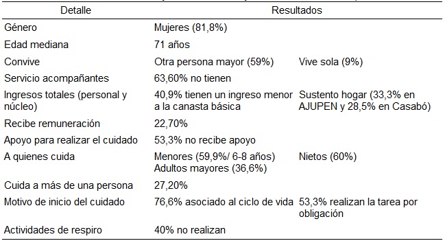 El rango de edad de los cuidadores se ubica entre los 63 y los 83 años, siendo la mediana de edad de 71 años. La mayoría son mujeres (81,8%).