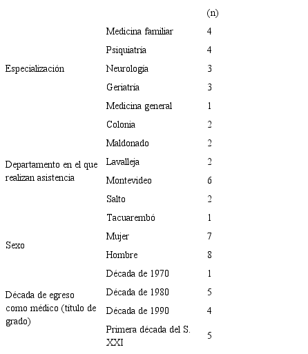Las entrevistas se realizaron en diferentes lugares: domicilio, locales de la Asociación Uruguaya de Alzheimer y Similares (AUDAS), de la Universidad de la República, centros comunitarios, organizaciones de personas mayores, entre otros. Los encuentros grupales de presentación y discusión de los resultados dirigido a las FC entrevistadas se realizaron entre los meses de agosto y setiembre del 2014 en las ciudades de Maldonado, Minas, Montevideo, Rosario, Salto y Tacuarembó. Por su parte, la muestra de profesionales tabla 2 quedó compuesta por 15 médicos que presentan un rango de edad de 33 a 76 años (media=49, mediana=49, moda=34). Salvo un caso, los demás trabajaban en más de un prestador de salud o institución de asistencia, y se desempeñaban simultáneamente en el sistema público y privado. Las entrevistas se llevaron adelante en los lugares que los profesionales indicaban, que en general eran sus lugares de trabajo (hospital o policlínica), en horario previo o posterior a su consulta. Algunas entrevistas se realizaron en consultorios particulares, en locales comunitarios y de la Universidad de la República.