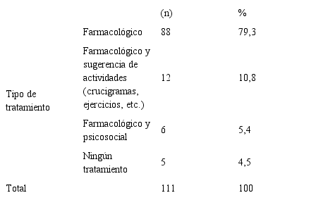 No se pudo constatar ninguna asociación significativa entre los tratamientos implementados y las diferentes variables sociodemográficas analizadas, tales como edad, sexo, lugar de residencia, sistema público o privado de atención, nivel educativo o económico, etc. Esto indica que el sistema de salud de Uruguay es accesible y equitativo para las personas con demencia y trastornos cognitivos. Sin embargo, su respuesta es muy limitada en cuanto a tratamientos, pues al momento del diagnóstico, el 90% de los tratamientos indicados son exclusivamente farmacológicos o acompañados de sugerencias de actividades menores. Solo a un 5% de la muestra se le indica un tratamiento farmacológico y psicosocial tabla 3.
