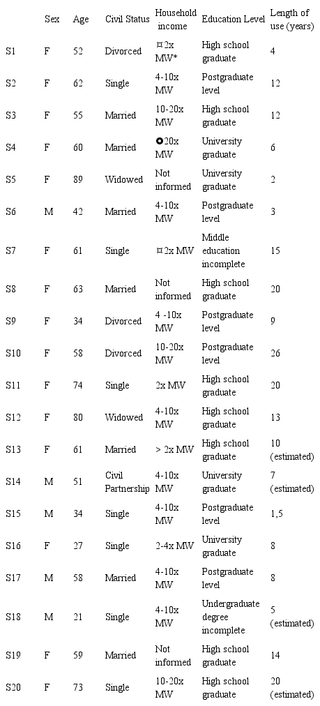 We collected an unintentional sample using the snowball technique. During the sampling process, there were no specific criteria, such as gender or educational level, although these variables will be important elements in further analysis. The inclusion criteria were: subjects over 18 years of age, who may be receiving psychiatric treatment or not, and who have been using the drug continuously for at least 12 months and are still using it at the time of the interview, not necessarily on a regular basis. Researchers presented the project to their social contacts, sending them emails in which they invited them to indicate people who fitted the inclusion criteria. After receiving each indication of a long-term user interested in collaborating, the members of the research group contacted these users by email or phone to arrange a time to conduct the interview. By the end of 2017, 20 clonazepam users who fitted the research criteria had been interviewed: 13 in 2015-2016 and seven in 2017. Four declined to participate after being contacted by phone, email, or text message. None of the subjects is related to any of the researchers. The users were enrolled on the study and given an in-depth, semi-structured interview by qualified interviewers. This paper presents the analysis of the first 20 interviews of the intended total of 50. The study, the consent forms, and all the other documents were approved by the research ethics committee (registered under CAAE 30889214.2.0000.5260). Below is a brief description of the research subjects and a few of their socio-demographic details.