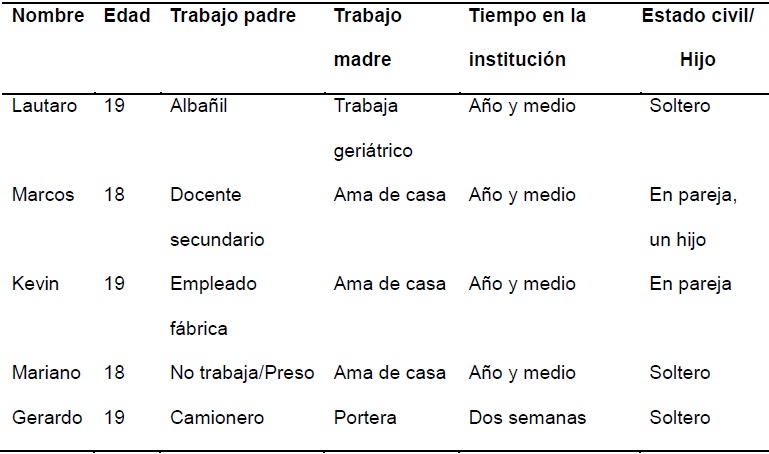 El estudio se realizó en un centro socioeducativo cerrado de la ciudad de Córdoba que recibe a jóvenes en conflicto con la ley penal - con sentencia firme o no - y que acorde a la normativa vigente debieran tener entre 16 y 18 años, aunque en la realidad se encuentran alojados jóvenes por debajo o encima de esta edad. Trabajamos con cinco jóvenes de entre 18 y 19 años de edad que se encontraban en uno de los pabellones durante el período en que duró la recolección de datos (julio – septiembre de 2017). La selección de los mismos se realizó a partir de un muestreo intencional que contempló como principales criterios de inclusión la edad (ser mayor de 17 años) y la participación voluntaria en el estudio. En la tabla 1 se presenta información sobre los datos sociodemográficos.