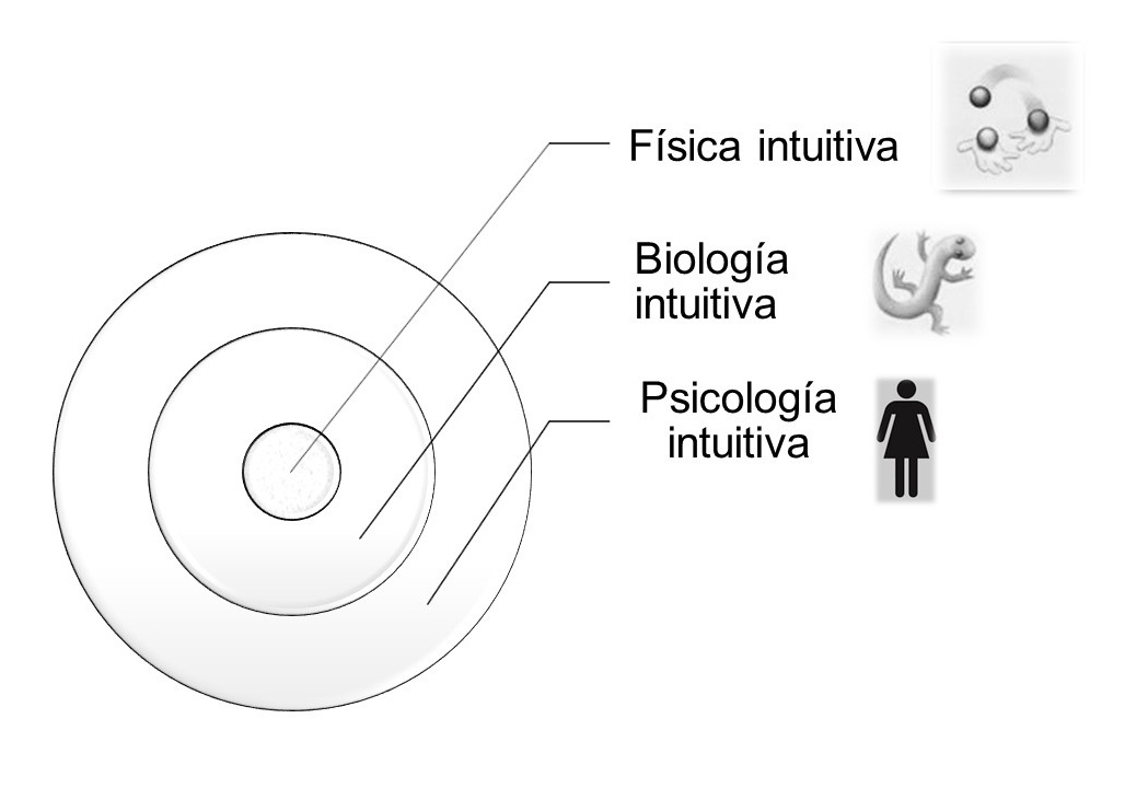 Como mencionábamos anteriormente, la idea de una teoría cognitiva sobre las creencias religiosas tiene antecedentes anteriores a la consolidación del campo de la CCR. El primero en plantear el estudio de la transmisión religiosa en términos cognitivosesel antropólogo Sperber (1975), quien introduce la idea de una "epidemiología de las creencias", encargada de estudiar cómo y porqué ciertas representaciones mentales se propagan mejor en las poblaciones humanas. Las ideas religiosas resultarían particularmente exitosas, siendo que surgen de mecanismos de interpretación simbólica -distintos a los del procesamiento racional de información- que involucran modos cuasi-aleatorios de búsqueda en la memoria, disparados ante situaciones ambiguas. Como resultado, los símbolos religiosos, a diferencia de los signos lingüísticos, terminan siendo un producto cognitivo sin propiedades sistemáticas, con una gran variación y maleabilidad individual.En 1980, Guthrie publica el artículo “Una teoría cognitiva de la Religión”, cuyas ideas desarrollará posteriormente en su libro “Rostros en las nubes” de 1993. En ambos retoma la idea clásica de antropomorfismo, donde la religión sería un sistema simbólico que utiliza “modelos humanos” –human-likemodels- para la interpretación de fenómenos no humanos (Guthrie, 1980). Guthrie discute con una tradición que desde Durkheim ha menospreciado la idea tyloriana de animismo como definición mínima de religión, y rescata nuevamente el problema de la sobre atribución de agencia como una característica universal de la religión. En el caso del budismo por ejemplo, ampliamente citado como una religión sin dioses, el autor señala como de todos modos las distintas ramas del budismo se encuentran profusamente invadidas por seres sobrenaturales, siendo el “budismo ateísta” una lectura filosófica y “libresca”, distante del budismo popular. Al igual que Sperber, para Guthrie las religiones son formas simbólicas derivadas de una forma de pensamiento que intenta explicar fenómenos que inicialmente se muestran ambiguos. Según el autor, los “modelos humanos” serían utilizados más frecuentemente dado que la mente humana está predispuesta la mayor parte del tiempo a procesar información en contextos de interacción social.En CCR, la interpretación de fenómenos naturales ambiguos en términos humanos se explicaría por la naturaleza profundamente social de nuestra mente/cerebro, pero también por un sesgo propio de la evolución de nuestra cognición, que tiende a sobre identificar agentes en el mundo circundante. Barrett (2000), lo denomina “Hiperactividad en el Dispositivo de Detección de Agentes” (de aquí en más, HDDA), siendo una disposición modular que surge durante la evolución natural no solo del ser humano sino también de otros animales (presente por ejemplo en el perro de Darwin). Esta hipervigilancia ha resultado más eficiente en términos adaptativos, si tomamos en cuenta que la identificación de “falsos positivos” –por ejemplo, reconocer un depredador donde no lo hay- no conlleva grandes riesgos, mientras que lo contrario puede ser fatal. La HDDA de Barrett supone a su vez que lo característico de la religión no sería el antropomorfismo, sino la identificación de agentes en términos generales, sean o no humanos.La idea es posteriormente elaborada por Barrett & Richert (2003), quienes a partir del estudio del desarrollo del concepto de Dios en niños y niñas proponen lo que denominan la “hipótesis de la preparación”. Para los autores, las representaciones tempranas de agentes sobrenaturales en niños y niñas se basan en estructuras conceptuales más generales que las antropomórficas, con dos características centrales: i. el reconocimiento general de agentes intencionales, incluyendo animales no humanos, lo cual implica una flexibilidad mayor a la hora de incluir propiedades “sobrehumanas”; ii. La tendencia que niños y niñas muestran a atribuir propiedades sobrehumanas a otras personas, por ejemplo sus padres o adultos en general (idea que los autores rastrean en las teorías de Piaget y Freud).Volviendo nuevamente a los inicios del programa de investigación de la CCR, Boyer plantea la idea de la "naturaleza de la religión" (Boyer, 1994), así como la hipótesis de que la religión se caracterizaría por el uso de "ideas mínimamente contraintuitivas" (Boyer, 2001). Como vimos anteriormente, la idea de la "naturaleza de las ideas religiosas" supone que existe un trasfondo cognitivo universal detrás de la formación de ideas en general. Siguiendo los estudios de Frank C. Keil en psicología del desarrollo, Boyer plantea cómo desde edad temprana desarrollamos naturalmente determinados principios intuitivos de dominio-específico, relacionados con una física intuitiva, una biología intuitiva, y una psicología intuitiva. Las categorías se encuentran anidadas jerárquicamente, y de cada una de ellas se derivan espontáneamente determinados “supuestos ontológicos” (Figura 1). Por ejemplo, inferimos y reconocemos cualidades propias de los objetos físicos y sus interacciones mutuas pero, al tratar con seres vivos, agregamos otras cualidades nuevas, en tanto les atribuimos también capacidad de agencia e intencionalidad. Al tratar con seres humanos, agregamos otras cualidades psicológicas, por ejemplo, creencias, sentimientos y expectativas. Siguiendo los estudios del antropólogo Scott Atran sobre la presencia transcultural de categorías como la de “seres vivos”, Boyer plantea como estas categorizaciones serían naturales, en tanto se encuentran determinadas por la arquitectura de nuestra mente/cerebro, más allá de sus manifestaciones particulares a nivel individual y/o cultural.