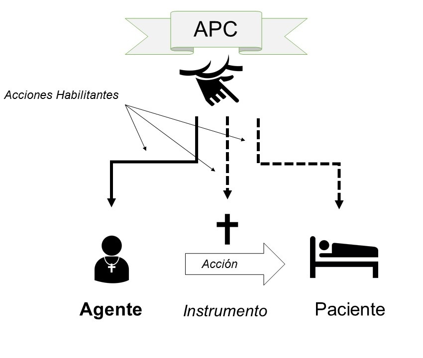 El “sesgo de contenido” atribuible a las “ideas mínimamente contraintuitivas” o a “agentes sobrenaturales” sería entonces condición necesaria pero no suficiente para explicar la transmisión de las creencias religiosas. Para una explicación más completa, el programa de investigación de la CCR debe incluir otros procesos cognitivos que intervengan en la consolidación de un compromiso epistémico y la adhesión por parte del creyente a determinadas creencias o doctrinas religiosas. En este aspecto, el estudio de los rituales religiosos ha ofrecido una ventaja, en tanto supone estudiar el contexto ritual y su incidencia sobre las funciones cognitivas para la producción, transmisión, memorización y adherencia a las doctrinas religiosas. Nuevamente, podemos mencionar a Sperber (1975) a la hora de entender el origen de las teoría ritual en CCR. Continuando con su crítica al simbolismo en tanto “sentido oculto a interpretar”, Sperber propone que en el ritual religioso tampoco existe un modelo interpretativo oculto. Para Sperber el ritual no tiene significado alguno, sino que sería un disparador de mecanismos de interpretación simbólica,al producir una situación ambigua e indeterminada que incita a la búsqueda de significado.En la misma década que Sperber postula su teoría cognitiva del simbolismo, surgen distintas propuestas que se alejan de formulaciones semánticas o interpretativas, y apuntan a entender la estructura del ritual en términos sintácticos, inspiradas en el modelo generativo de la lingüística chomskiana. Primero Lawson (1976) propone entender el ritual como unidad sintáctica dentro de un sistema ritual, al igual que una frase u oración es el producto de la gramática de un lenguaje. Unos años después, Staal (1979) planteará una teoría ritual a partir del estudio etnográfico del ritual Agnicayana del sur de la India, observando la ejecución de dicho ritual, y comparándolo con el canon de los textos antiguos. Para explicar la capacidad de los brahmanes de recordar todo el extenso procedimiento ritual de varios días, Staal propone que toda la complejidad de la acción ritual puede entenderse bajo reglas estructurales de composición y transformación, aplicadas de manera recursiva. Al igual que Sperber, Staal propone que el ritual en sí mismo no tiene un sentido intrínseco; lo importante es su secuencia, sobre la que las personas vuelcan un contenido, construyendo distintos sentidos. Pero es recién en la década de los noventa, cuando Lawson & McCauley (1990) publican “Repensando la Religión”, que comienza uno de los debates fundacionales de la CCR. Siguiendo la analogía lingüística propuesta anteriormente por Lawson (1976), los autores proponen una “hipótesis de la forma ritual”, donde describen los componentes estructurales de la acción ritual en términos de una“teoría de la competencia”, en el sentido chomskiano de la palabra. Dicha teoría supone relacionar al ritual con capacidades cognitivas naturales de la mente humana, encargadas de la representación de la acción de agentes. Para ello, los autores distinguen entre un nivel semántico del ritual religioso y una sintaxis subyacente, donde es posible capturar la estructura cognitiva del ritual en tanto “sistema de representación de la acción”, análogo a la construcción de frases en lingüística.El ritual, al igual que todo sistema de representación de acciones, estaría compuesto por elementos constituyentes y reglas de formación, pudiendo ser desagregado en tres elementos principales: el sujeto/agente del ritual, el paciente/objeto, y la acción que une a ambos. Hasta allí el ritual no se diferenciaría dela representación de otras acciones cotidianas u ordinarias. Lo que distinguiría al ritual en tanto práctica religiosa sería la conexión de uno de éstos elementos con lo que los autores denominan “Agentes sobrehumanos Postulados Culturalmente” (de aquí en más APC). Toda acción religiosa ritual involucraría entonces a un agente realizando una acción sobre un paciente/objeto, que tarde o temprano debe estar conectada con un APC, a través de lo que los autores denominan “acción habilitante” (figura 2).Los autores distinguen tres tipos de acciones habilitantes. La acción habilitante APC-agente (marcada con línea completa) es una conexión “fuerte”, por lo que resultará en un ritual de mayor intensidad, dada la presencia de dicho agente. Las otras dos acciones restantes (APC-instrumento y APC-paciente, marcadas con línea punteada) son de conexión “débil”, y serán de menor intensidad, lo cual generará una mayor necesidad de repetición del ritual para garantizar su efecto. Describir la estructura ritual total implica conectar un ritual en particular con las “acciones habilitantes” que lo interconectan en un sistema más amplio de rituales y agentes sobrenaturales. Si no hay una referencia directa a algún APC en la estructura inmediata del ritual, debe haber al menos algún elemento conectado con otro ritual que eventualmente conecte con algún APC. La conexión con los dioses es sumamente importante en tanto ellos son los poseedores de la “información estratégica”, necesaria –aunque no suficiente- para que el efecto del ritual sea exitoso.
