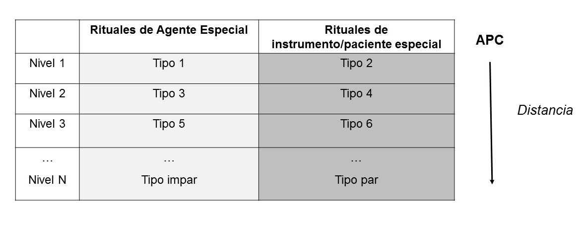 La representación del ritual deriva entonces de nuestros sistemas cognitivos ordinarios, principalmente de nuestras categorías de representación de la acción de agentes, a la que se agrega cierta conexión directa o indirecta con un APC. Lo central en cada ritual es si este APC se encuentra presente, y si no es así, cuál es el elemento en el ritual que conecta con el mismo. Para lograr una descripción estructural completa del sistema ritual en una religión dada, es entonces importante considerar dos principios generales. En primer lugar, el “Principio de Agencia Sobrehumana”, que implica establecer de qué modo y a través de qué elemento el ritual está conectado a un APC. Si está conectado con el agente del ritual (por ejemplo, un cura o chamán), hablamos de un “ritual con agente especial”; si está conectado con el paciente se trata de un “ritual con paciente especial”, y si está conectado con un instrumento es un “ritual con instrumento especial”. Dentro de estos tres tipos se destacan los rituales de agente especial, en tanto son los que permiten un mayor grado de conexión con el APC. Éstos rituales por lo general no necesitan ser repetidos (cuánto más directa la intervención del APC menos necesaria es la repetición del ritual) así como tienen un carácter irreversible (la intervención directa del APC genera efectos “superpermanentes”).En segundo lugar, tenemos el “principio de Inmediación Sobrehumana”, que implica determinar la distancia entre el ritual estudiado y la aparición inicial del APC. Dicho de otra manera, consiste endescribir el número de “acciones habilitantes” requeridas para conectar un elemento del ritual actual con un APC. Podemos entonces trazar una tipología de los rituales dentro de un sistema religioso dado (figura 3). Se distinguen cualitativamente los rituales impares (conexión APC-agente) de los pares (conexión APC-instrumento o paciente). A su vez, dentro de cada categoría, la importancia del ritual estará determinada por la distancia del mismo en relación al APC. Por ejemplo, un ritual tipo 3 no se conectará directamente a un APC, sino a un ritual tipo 2, que se conectará al APC, estableciéndose una mayor importancia del segundo sobre el primero.Las conexiones entre un ritual determinado y el APC puede variar en cercanía o lejanía, a través por ejemplo de una autoridad religiosa (números impares de la tipología), o a través del paciente o los instrumentos del ritual (números pares).
