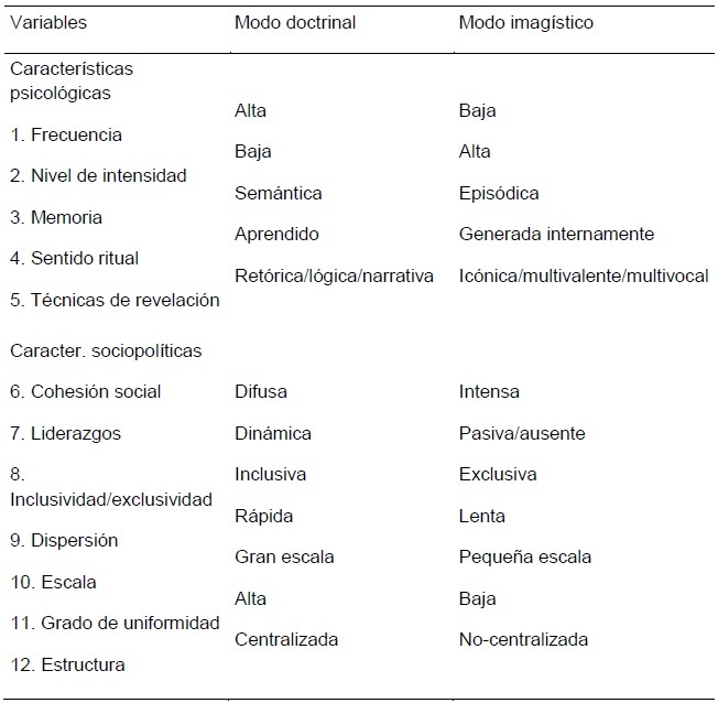 Esta tipología permite plantear ciertas conjeturas, como ser que, dentro de una comunidad religiosa en particular, el grado de intensidad sensorial será mayor cuando se trata de tipos impares en relación a los pares, sin importar la profundidad ritual. En los tipos impares, la conexión con el “agente” del ritual involucra una acción más directa del APC, que requiere una “pomposidad” mayor para demostrarla importancia de la acción realizada.Las extremas emociones provocadas en este tipo de rituales son útiles para persuadir a los participantes de que los cambios extraordinarios se han producido efectivamente. A su vez, rituales impares-como casamientos, ordenaciones o ritos de iniciación- no son repetidos generalmente, dado que la autoridad religiosa intermediaria del APC garantiza efectos “superpermanentes”. Por el contrario, los tipos pares de rituales requieren ser realizados más frecuentemente dado que no tienen efectos “superpermanentes”, y requieren menos “pomposidad” ya que están más alejados de la presencia “sobrenatural” del APC. Vemos entonces como estos dos principios permiten clasificar los rituales en sus distintas características: la reversibilidad o irreversibilidad de su efecto, la necesidad de repetición, el lugar central o periférico del mismo en el sistema religioso, el grado de componentes emocionales o sensoriales.Pocos años después de la publicación de Lawson & McCauley, el antropólogo Whitehouse (1995) propone su “hipótesis de los modos de religiosidad”, elaborada luego de su trabajo de campo en Papúa Nueva Guinea.En su trabajo etnográfico, Whitehouse observa como los habitantes del poblado Dadul efectúan una serie altamente repetitiva de sistemas rituales denominados PomioKivung. Pero de dicho grupo, emerge un movimiento reformista, que comienza a utilizar rituales emocionalmente cargados, bajo la concepción de un retorno de los ancestros del poblado. Whitehouse analiza cómo en los rituales Kivung tradicionales predomina un estilo menos emocional,más lógico e integrado. Por el contrario, en los rituales del grupo reformista predomina una alta estimulación sensorial e intensidad emocional. A partir de éstas diferencias el autor propone distinguir dos modos de prácticas rituales: el modo “doctrinal”–caracterizado por su alta frecuencia y baja estimulación, favoreciendo la memoria semántica-y el modo “imagístico”–caracterizado por su menor frecuencia y alta intensidad, favoreciendo la memoria episódica-.Tal y como señala Whitehouse, la idea no es nueva, siendo que esta dicotomía ha sido reconocida por las ciencias sociales desde sus inicios, por ejemplo en la distinción entre religiones carismáticas y rutinizadas utilizada por Max Weber. El elemento cognitivo que la teoría de Whitehouse agrega a esta dicotomía clásica es el de la memoria, resaltando la importancia de dichos modos ritualísticos en la transmisión de las ideas religiosas, sea a través de la memoria semántica en los modos doctrinales, o de la memoria episódica en los imagísticos. Ambos modos de religiosidad implican distintos estilos cognitivos de memorización y transmisión de conocimiento. En los modos doctrinales de religiosidad la frecuencia repetitiva facilita el aprendizaje de doctrinas y narrativas, a través del uso de la memoria semántica. La repetición lleva a una reducción en los niveles de motivación (el “efecto tedio”), por lo que deben utilizarse incentivos negativos (e.g. sanciones sobrenaturales) como positivos (promesas de vida eterna o salvación). Los modos doctrinales de religiosidad involucrarían entonces un conjunto de elementos mutuamente reforzantes, que cuando entran coalición generan sistemas históricamente robustos de religiosidad que pueden perdurar por siglos. Se ofrecen como dispositivos mnemotécnicos que permiten estandarizar un cuerpo doctrinal ortodoxo y centralizado. Probablemente surjan recién en la edad de bronce, en sociedades de gran escala, con necesidades de cooperación rutinizada, y donde el anonimato de las grandes comunidades hace necesario este tipo de mecanismos de memorización colectiva para la fijación de un corpus doctrinal entre los distintos miembros de su población.Los “modos imagísticos” de religiosidad son por el contrario altamente estimulantes, tienen una baja frecuencia en su realización y suelen favorecer la memoria episódica para condicionar el recuerdo de los detalles de la acción ritual. Este tipo de rituales desencadenan una “reflexión exegética espontánea”, que conlleva revelaciones o inspiraciones personales, así como la consecuente búsqueda de significado de las experiencias multivalentes y las imágenes religiosas del ritual. Esta reflexividad individual inhibe a su vez la centralización religiosa, tanto en la formación de líderes como en la producción de una ortodoxia. Los lazos emocionales que se producen en dichos rituales son propios de comunidades pequeñas y simples, donde son comunes las prácticas de trance. Probablemente sean formas de religiosidad muy antiguas, cuyos orígenes se remontan al Paleolítico Superior.Tanto en la “hipótesis de la forma ritual” como en los “modos de religiosidad”, el ritual es entendido como una práctica fundamental en la creación, transmisión y memorización de las ideas religiosas, principalmente en sociedades donde predomina la transmisión oral, y no existe la escritura. El problema es aún mayor en sociedades de gran escala, donde predomina el anonimato de sus miembros, aspecto que la teoría de Whitehouse es capaz de explicar en mejor forma, a través de sus modos doctrinales. Cabe destacar que la teoría de los modos no es solamente una teoría cognitiva, sino también una teoría social, proponiendo un modelo de múltiples variables (tabla 1), donde el problema clave es cómo estos estilos cognitivos se relacionan con variables no cognitivas, que Whitehouse cla