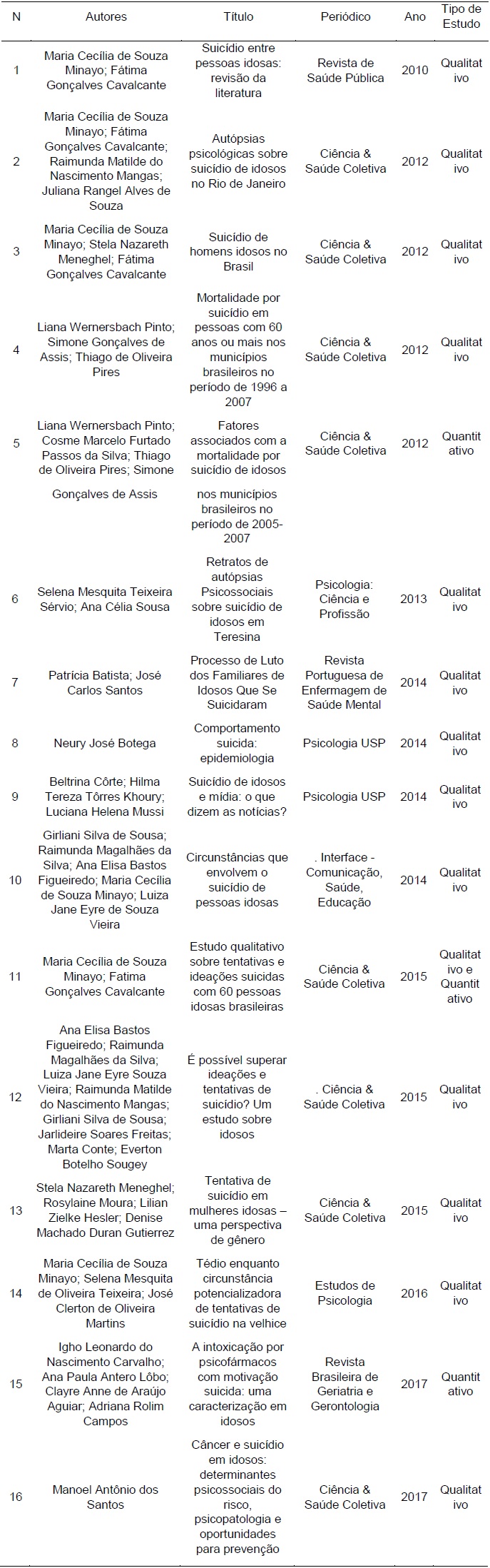 A partir da sistematização dos procedimentos de busca e seleção dos artigos, foram selecionados e lidos na íntegra 32 artigos do banco de dados Scielo (Scientific Electronic Library Online) por este abarcar um bom número de artigos de diferentes revistas e periódicos. Após a leitura dos artigos, foi realizado um maior refinamento entre os artigos selecionados em busca de uma acurácia com o objetivo proposto, restando 16 artigos para as referências da revisão literária por estes trazerem dados de diferentes regiões do país, diferenciações quanto ao gênero e idade, apresentarem fatores associados diversos e versarem sobre a prevenção e posvenção do suicídio entre idosos no país. Os mesmos são descritos na Tabela 1, organizados por ano de publicação, além de abarcar dados dos autores, título, periódicos em que se encontram e o tipo de estudo dos artigos.