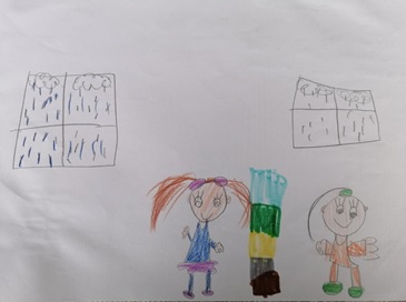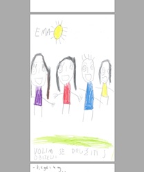 More than half of the children in the sample (N = 36, 57.1%) recognize the family as personal and social wellbeing. They state that they are happy in various family interactions. Most children (N = 19) emphasize the importance of family time together (socializing, trips, walks) (Figure 1.). This is supported by the statements: "I like it best when we all laugh together" and "I am happiest when mom and dad do not have so much work so we can be happy together". Some children differentiate activities with their parents, so 6 boys state that they like to spend time with their father (they do something together), and 4 girls want to be with their mother. A child, whose parents are divorced, emphasizes playing with both parents individually ("I play football with my dad; I mostly build Lego with my mom"). Three children emphasize the importance of family support, of which one boy singles out family cheering (at a sporting event), when he helps his brother and when they help him. Only one child states that "without mom and dad, I am sometimes a little sad ". One child (one-child family) concludes that "it is better for me in ECE settings than at home because there is someone to play with in ECE settings" (i.e. Figure 2.). Two children list members of the extended family as one of the predictors of wellbeing ("I like to hug, and my grandmother's house is close", "If mom and dad do not come - then grandma comes to pick me up in ECE settings").