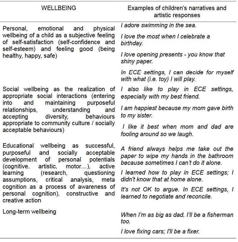 Conversations with children were recorded with the child’s consent (e.g. This conversation is very important, do you agree that I record it?). Since teachers often keep ethnographic notes during the work, children are familiar with this way of documenting. The responses were coded according to the interpretation of wellbeing given in the NKRPOO (MZOS, 2015), but the category of long-term wellbeing was added to the existing categories (Table 1). In total 67 art works were collected, which the children supported with verbal interpretations.