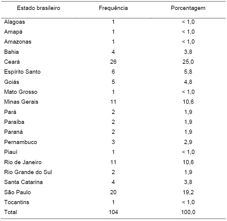 Contou-se com a participação de uma amostra não probabilística composta por 104 psicólogos que atuam em CAPS de todas as modalidades (CAPS Geral, CAPS AD - Álcool e outras drogas e CAPSI - Infantil), em 19 estados de diferentes regiões brasileiras, sendo a maioria do Ceará (f = 26; 25,0%) e de São Paulo (f = 20; 19,2%), de ambos os sexos (ver Tabela 1). A maioria dos participantes é mulher (f = 89; 85,6%), com idade média de 35,58 anos (DP = 9,9), formada há 10,2 anos e atua, predominantemente, no interior (f = 61; 58,7%), em seguida, na capital (f = 24; 23,1%) e região metropolitana (f = 19; 18,3%). Quando necessário, os participantes serão identificados nesta pesquisa pela letra “P” seguida de um número (e.g. P3, P12, P65).