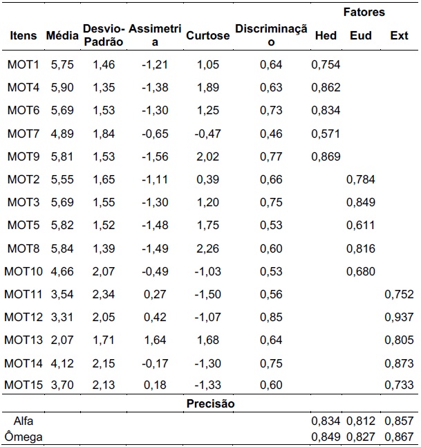Inicialmente para estimar evidências de validade baseada na estrutura interna da Escala de Motivações Hedônicas, Eudaimônicas e Extrínsecas no exercício físico na população brasileira, foi realizada uma análise fatorial confirmatória. Os resultados indicaram bons índices de ajustes (χ2(gl) = 331,428(87)* RMSEA = 0,108 I.C. 90% [0,096 – 0,120]; CFI = 0,945; TLI = 0,933) para o modelo. Como é possível observar na Tabela 1, as cargas fatoriais variaram entre 0,571 e 0,937. As médias dos itens variaram entre 2,07 e 5,90, sendo que os itens 4 e 9 apresentaram as médias mais altas, mostrando-se itens mais facilmente endossados pela amostra. Enquanto o item 13 apresentou a média mais baixa, e portanto, menos endossado. A assimetria dos dados variou entre -1,56 e 1,64, com a maior parte dos itens apresentado valores negativos, os quais indicam que a maioria dos escores está concentrada à direita da distribuição. A curtose variou entre -1,50 e 2,26, com maior parte dos itens apresentando valores positivos, sugerindo uma distribuição levemente leptocúrtica. A discriminação dos itens, que variou de 0,46 a 0,85, reflete a capacidade de cada item de diferenciar entre participantes com diferentes níveis de habilidade. Ademais, foram verificados bons índices de precisão para os fatores (ver Tabela 1).