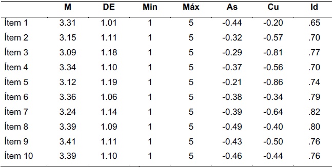 Los 10 ítems obtuvieron promedio en sus puntajes que varían entre 3.09 y 3.41, con desviaciones estándar moderadamente heterogéneas en el rango de 1.01 a 1.19 (ver Tabla 1). Los valores negativos en la asimetría variando entre -0.21 a -0.49, indican una ligera tendencia sobre las medidas promedio. En términos de sesgo, los valores de curtosis y asimetría sugieren una ausencia de tales sesgos (<3 en asimetría y <8 en curtosis). Además, se reportan medidas de discriminación de los ítems, quiénes obtuvieron valores iguales y superiores a .65.