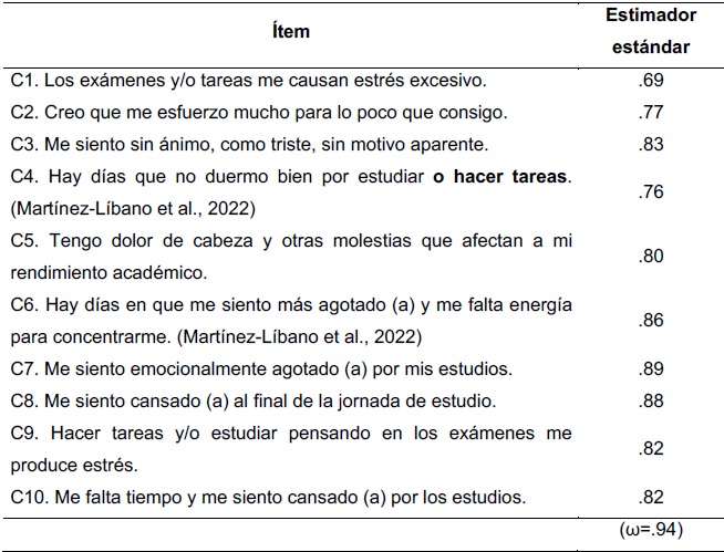 Para realizar los cambios, se consideraron los siguientes aspectos: a) Uso del lenguaje inclusivo: Conforme a las recomendaciones de la Asociación Americana de Psicología (APA), se modificaron expresiones que hacían referencia exclusivamente a varones. Por ejemplo, términos como “cansado” (ítems 8 y 10) o “agotado” (ítems 6 y 7) fueron ajustados añadiendo la expresión “(a)” para incluir a las mujeres. b) Incorporación de actividades relevantes: Se añadió la actividad “tareas” junto con “exámenes” o “estudio” (en los ítems 1, 4 y 9). Esto responde a la consideración de que, además del estudio para los exámenes, la realización de tareas también constituye un factor de agotamiento (Hederich-Martínez y Caballero-Domínguez, 2016), aspecto omitido en la escala original. c) Sustitución de términos poco frecuentes: Se reemplazó el concepto “desbordado” por “cansado” en el ítem 10, debido a su uso poco habitual entre los universitarios peruanos. d) Revisión de ítems específicos: Dos ítems (4 y 6) fueron adaptados del estudio de Martínez-Líbano et al. (2022). El primero hace referencia a la pérdida de sueño; mientras que la versión original aborda este fenómeno de manera general, la propuesta de Martínez-Líbano et al. (2022) lo atribuye específicamente al estudio, además de incluir la expresión “hacer tareas”. El segundo se modificó debido a que su redacción resulta más familiar en el contexto peruano. La versión final de los ítems se puede apreciar en los resultados, en la tabla 2.