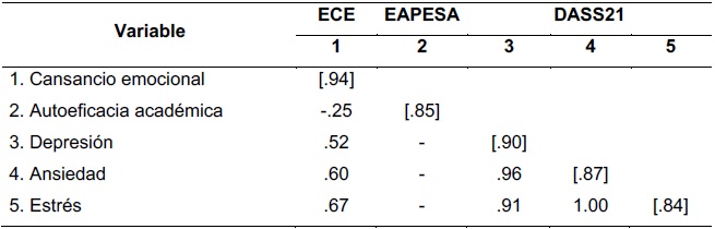 Para examinar la validez convergente, se utilizó la metodología de ecuaciones estructurales, estimando las covarianzas entre las variables, quienes asumen a las variables como latentes. Las covarianzas estimadas fueron positivas entre los factores de la subescala de la ECE y las variables que comprende el DASS21 (ver Tabla 3). De acuerdo con estos datos, un mayor cansancio emocional se relaciona con mayores niveles en depresión (.52), ansiedad (.60) y estrés (.67). Luego, los factores de la ECE y la autoeficacia académica (EAPESA) covariaron en un sentido negativo (-.25). Esta covariación sugiere que niveles altos de cansancio emocional están vinculados con niveles más bajos de autoeficacia académica.