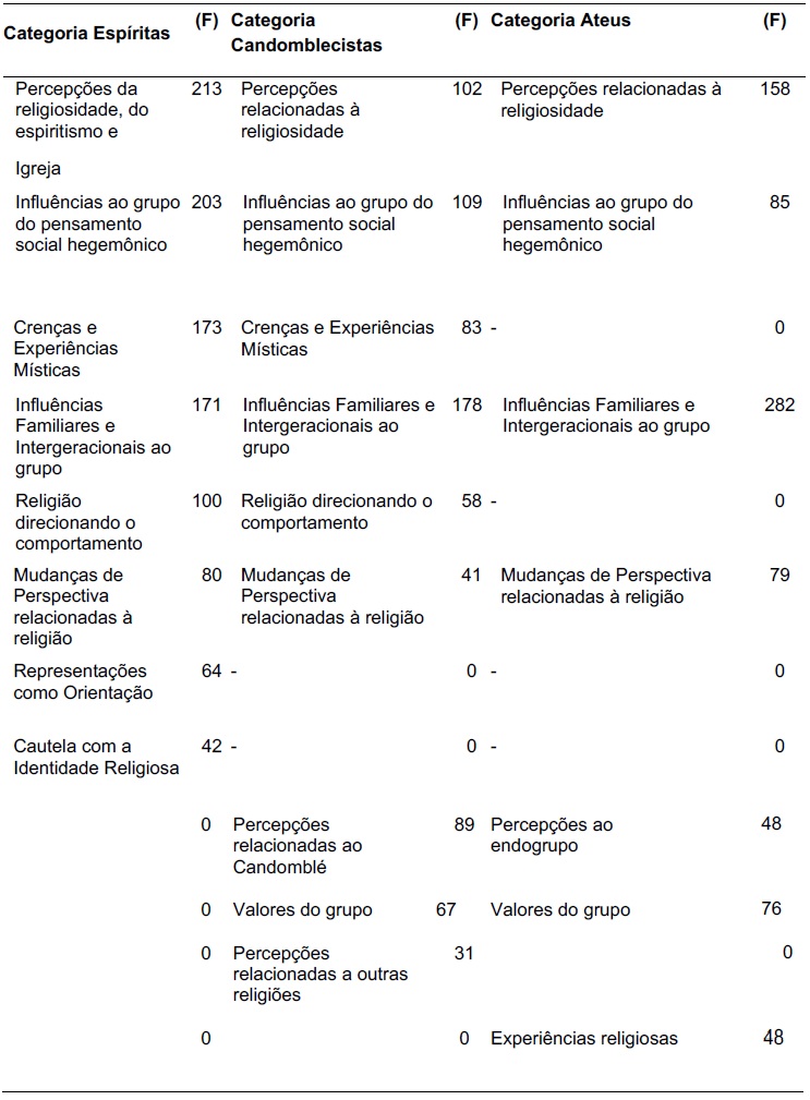 Seguindo uma lógica de comparação da diferenciação, na tabela 1 apresentam-se as categorias da Análise de Conteúdo das entrevistas de espíritas, candomblecistas e ateus, para facilitar a compreensão de suas similaridades e discrepâncias.