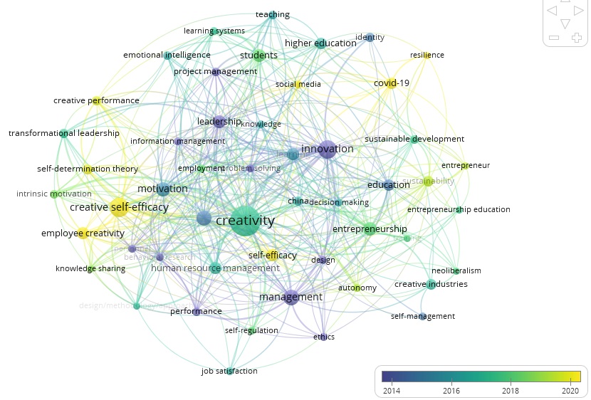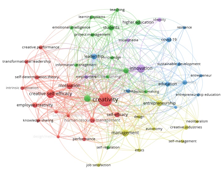 This clustering reveals the primary themes and their interconnections within the literature on creativity, self-awareness, and management. The size of each cluster indicates the relative prominence of these themes in the analyzed body of research.