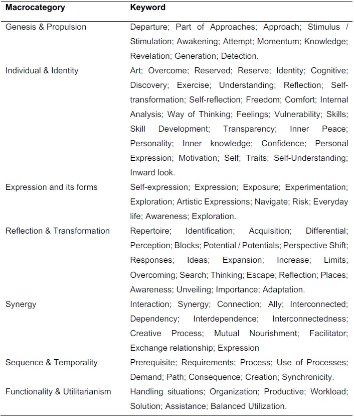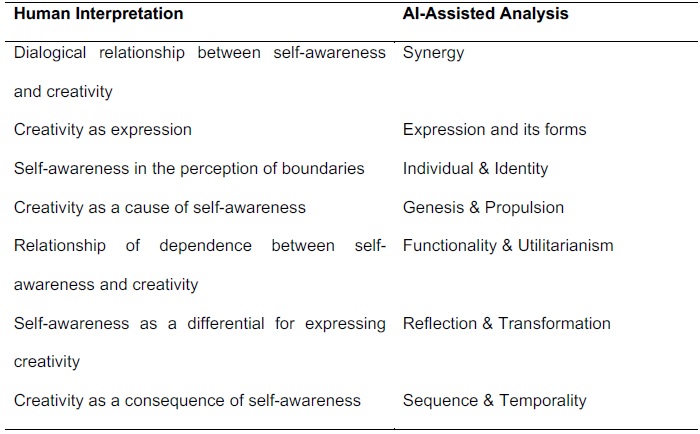 It is possible to identify correlations, such as in the case of the macro-category 'Synergy,' aggregated through keywords that examine the relationship between self-awareness and creativity from a more synergistic, interdependent perspective. It is associated with the category developed in the human interpretation analysis 'Dialogical relationship between self-awareness and creativity.' Both categories address this relationship as interdependent.
