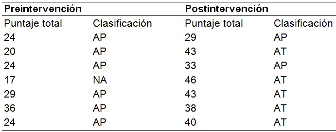 Previo a la intervención, 6 de 7 usuarios presentaron AP, y solo 1 de ellos era NA. Luego de la intervención, el 100% de los participantes mejoraron su puntaje en la escala de adherencia. 4 usuarios pasaron a una categoría superior: de AP a adherentes totales (AT); uno avanzó 2 categorías: de NA a AT, y 2 de ellos permanecieron en la misma categoría: AP, aunque mejoraron su puntaje.