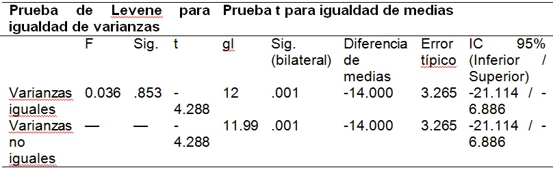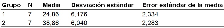 Para establecer si los cambios tenían significancia estadística se utilizó la prueba t-Student para muestras independientes, para el contraste de hipótesis. Las asociaciones significativas se determinaron a través de la prueba de Chi cuadrado, en el nivel de p <0,05. El 100% de los datos fueron válidos para el análisis. La media de la variable adherencia terapéutica en el grupo pre - intervención fue de 24,86, y en el post - intervención fue de 38,86 (Tabla 2).