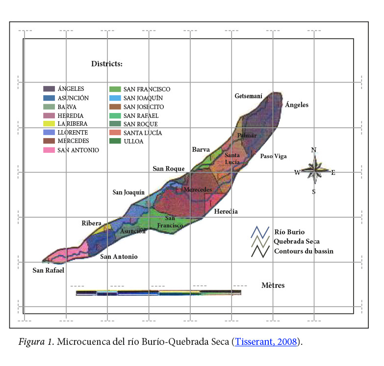 El estudio se realizó en la microcuenca del río Burío- Quebrada Seca. El río Burío nace en Los Ángeles de San Rafael de Heredia y recorre parte del cantón de Barva; en su zona media atraviesa el cantón Central de Heredia y en el límite de este con el cantón de Flores se une a su tributario Quebrada Seca. Estos continúan su recorrido (como río Burío-Quebrada Seca) por los cantones de Flores y Belén, para finalmente desembocar en el río Bermúdez, en San Rafael de Alajuela (Zamora, 2002) (Figura1).