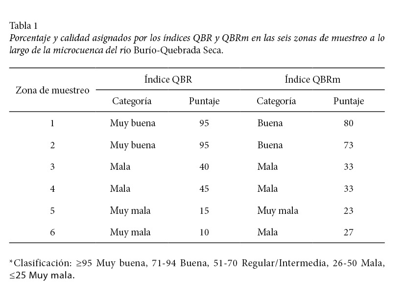 El índice QBRm arrojó un puntaje de 80 para la zona de muestreo 1, lo cual la colocó en la categoría de calidad “buena”; la zona 2 también fue clasificada de calidad “buena” con un puntaje total de 73. Las zonas 3 y 4 obtuvieron una clasificación de “mala” calidad con un puntaje total de 33 y las zonas de muestreo 5 y 6 se caracterizaron como de “muy mala” calidad (23 puntos) y de “mala” calidad (27 puntos), respectivamente.