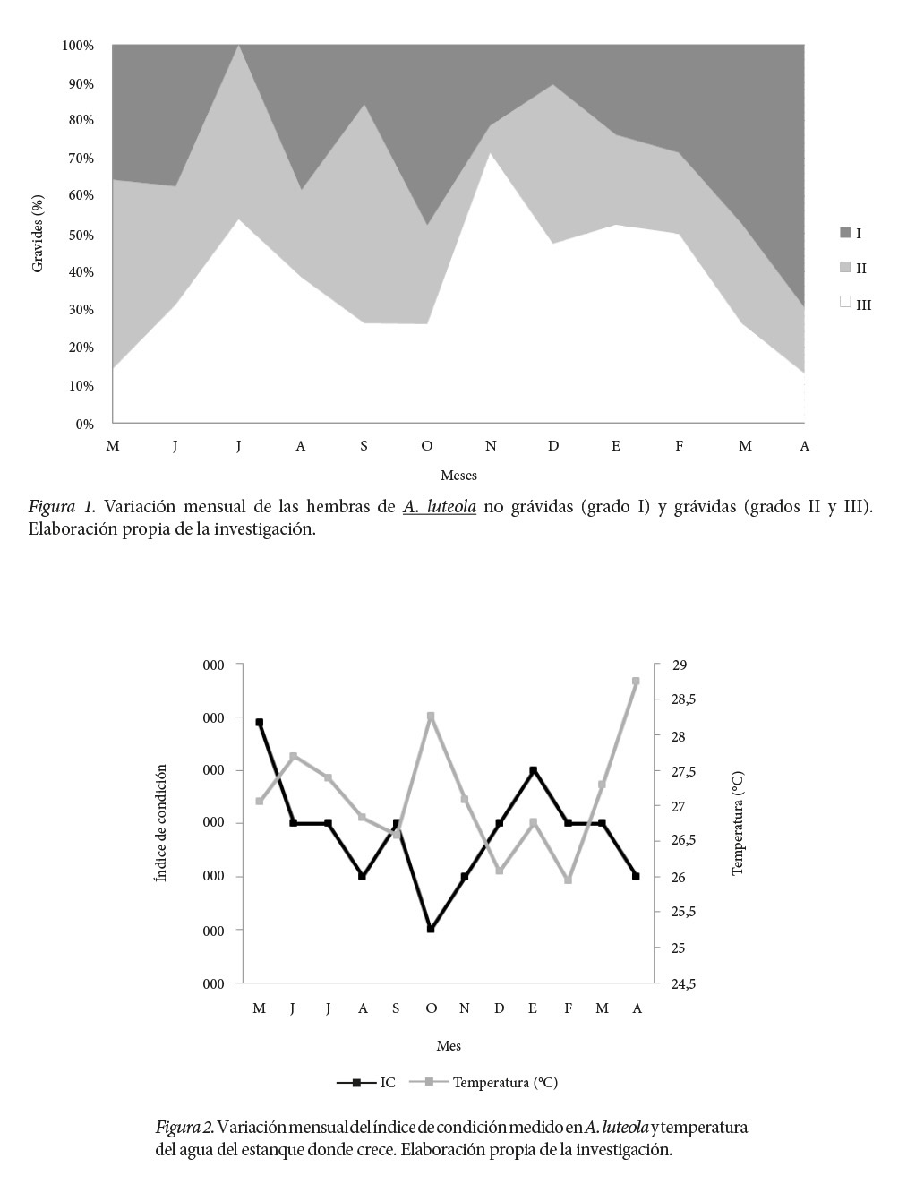 El índice de condición calculado para A. luteola varió entre 0.11 y 0.15 con un promedio de 0.13 ± 0.02. El valor más alto resultó en el mes de mayo (0.15) y el más bajo (0.11) en octubre. El coeficiente de correlación calculado entre el índice de condición y los ejemplares no grávidos (grado I) resultó ser de -0.27.
