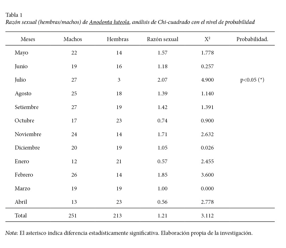 Los machos y hembras de A. luteola mostraron equilibrio en la proporción sexual, lo que permite que cada hembra madura tenga mayor posibilidad de ser fecundada, redundando en el éxito de la reproducción. Los resultados de este estudio mostraron que las hembras de A. luteola maduran a tallas mayores que los machos, situación similar ocurre en Diplodon chilensis (Semenas & Brugni, 2002). Según Honkoop et al. (1999), los huevos de los bivalvos contienen gran cantidad de lípidos con relativamente mayor contenido de energía que la proteína y carbohidratos, por lo tanto, de mayor costo energético. De acuerdo con Ilano et al., (2003), el uso de las reservas de la glándula digestiva para las actividades reproductivas en las hembras y no en los machos también está probablemente relacionado con la mayor inversión reproductiva en las hembras.