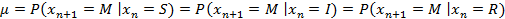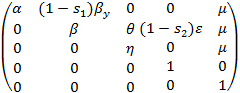 Se declara una cadena de Markov discreta homogénea con los estados antes mencionados, donde se toma un mes como unidad de tiempo. Para la cual la respectiva matriz de transición