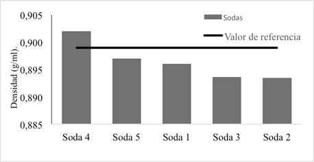 Mora (2007), encontró en su estudio que la densidad es una de las características físicas que aumenta en los aceites usados. Para esta característica, se utilizó un valor de referencia de 0,899 (g/ml) para un aceite de palma refinado sin usar (Becerra et al., 2011); se logra determinar una variación máxima de 0,006 (g/ml) en una de las sodas analizadas (Gráfica 1).