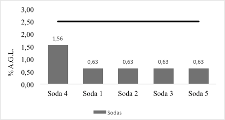 El porcentaje de ácidos grasos libres (Gráfica 2) en los aceites residuales de la primera semana de generación se encuentra por debajo del límite permitido por el Decreto 37308-S; no obstante, la soda cuatro presenta el mayor porcentaje, esto atribuible a los problemas que presenta la campana de extracción de este establecimiento; otra causa puede ser un alto contenido de agua en los alimentos que preparan.