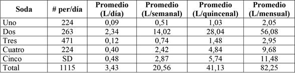 En la Tabla 2, se presenta la tasa de generación de aceite residual por soda, mediante la que se determinó que la soda dos es la que presentó una mayor generación y supera a la tres, la cual tiene mayor población usuaria de plato principal, según un estudio de la VVE (2014).