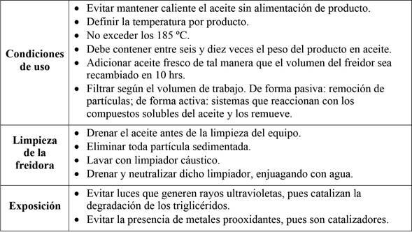 Para evitar la degradación del aceite, se debe filtrar siempre después de que se realiza la última fritura del día, esto para eliminar los restos de materia orgánica de las frituras anteriores y así prolongar su vida útil; no obstante, se determinó que la reutilización del aceite se puede dar por seis frituras, si usa freidora, siempre y cuando se adicione aceite nuevo a este. En cambio, si se utiliza una olla o sartén, se permite el uso para cuatro frituras, según pruebas realizadas. Para realizar la comprobación, se sugiere la determinación de los compuestos polares en el aceite, mediante el uso del Kit Oleotest, o con el medidor de compuestos polares.