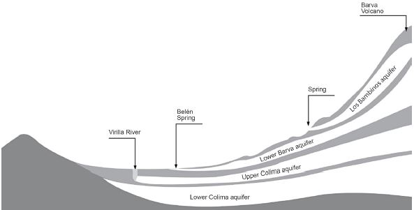 The Barva Multi-aquifer System, also known as the Barva aquifer, has an area of 189 km2 and consists of three formations that host sub-aquifers in fractured volcanic rocks (BGS / SENARA, 1985, Rodríguez, 2002, Ramírez and Alfaro, 2002): Bermúdez (the Lower Barva aquifer, the most extensive), Bambinos, and Los Ángeles (Upper Barva aquifers) (Figure 1). Each sub-aquifer is separated by tuffs and weathered pyroclasts. The Barva aquifer has a saturated thickness that ranges from approximately 4 to 66 m. The Bermúdez Formation is underlain by the Tiribí Formation, which is the base of the Barva aquifer in the central and western sectors, and the Zurquí Complex, which is the base of the Barva aquifer in the eastern sector. The upper and lower Colima aquifers are located under these formations (Figure 2). The upper areas of the Bambinos and Los Angeles sub-aquifers are recharged by direct infiltration of precipitation. The Lower Barva sub-aquifer in these sectors is recharged by drainage from these two sub-aquifers through tuffaceous material. In the rest of the territory, the aquifer is recharged by direct infiltration. It is estimated that recharge of the Barva Multi-aquifer System varies between 30 and 55% of precipitation, depending on permeability, the hydraulic conductivity of the tuffs, and the amount of rain in each sector of the aquifer (Gómez, 1987; Reynolds-Vargas, 1997; Ramos, 2001). The sub-basin of the Bermúdez river has an area of 73.72 km2, the sub-basin of the Ciruelas river has an approximate area of 90.41 km2, while the sub-basin of the Río Segundo has an area of 85.58 km2.