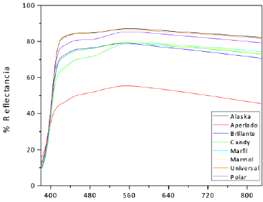 Cabe destacar que como muestra atípica se reconoció al blanco aperlado, con los valores más bajos de L* y de WI de la serie estudiada. Al observarse los espectros de reflectancia difusa, se determina que esta muestra es la que presenta también los valores más bajos de % R en todo el intervalo espectral.
