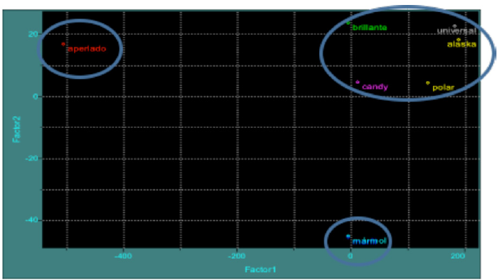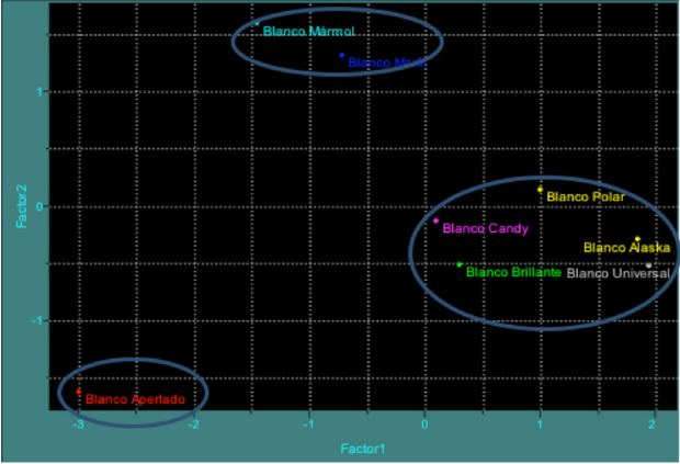 En la Gráfica 5 se muestra la distribución de las lacas en función en el espacio definido por los factores 1 y 2 elegidos. La aplicación de la técnica de Análisis de Conglomerados por K-medias a los scores llevó a identificar también tres grupos, con los mismos integrantes en el análisis cromático y en el espectral, de acuerdo con la comparación de las gráficas 1 y 5. Aunque las muestras de blanco mármol y blanco marfil se encontraron en el mismo grupo, no resultaron prácticamente iguales como en el caso del análisis de datos espectrales.