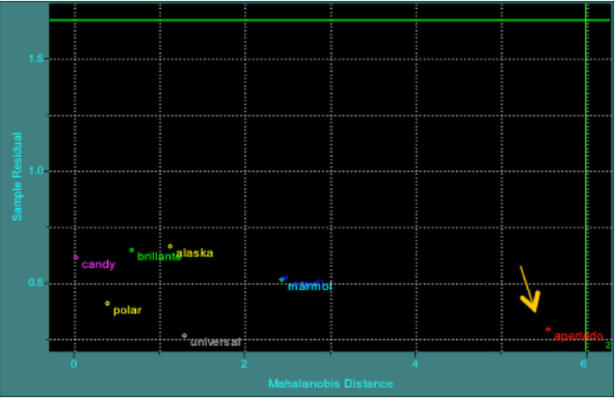La aseveración de que la muestra de laca aperlada es la más diferente de la serie puede corroborarse a través de la representación de la distancia de Mahalanobis en el análisis por PCA (Gráfica 2). Este parámetro matemático se utiliza en la identificación de objetos aberrantes u outliers, estimando distancias multivariables para identificar sus tendencias de distribución. Aunque con dos factores no se identifica la laca aperlada como un objeto aberrante, lo cierto es que se encuentra prácticamente en el límite (véase flecha en Gráfica 2).