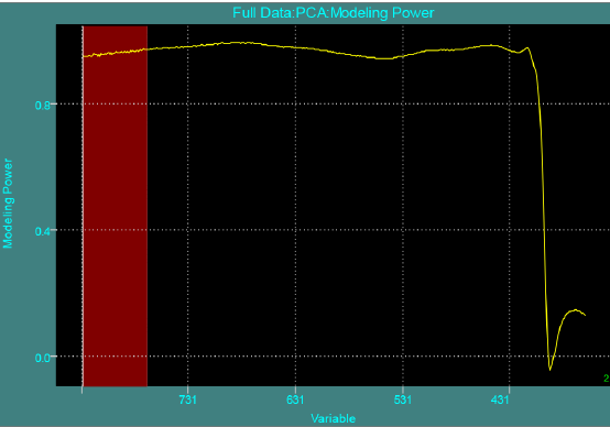 Por otro lado, la visualización del poder de modelación en la Gráfica 3 permitió identificar que, para describir el sistema en el esquema de Componentes Principales, las variables más significativas fueron aquéllas comprendidas en el intervalo de 425 a 830 nm, prácticamente toda la región visible del espectro electromagnético. Conforme el poder de modelación se acerca a 1, mayor es la importancia de la variable para describir el sistema; en este caso, tal indicador se encontró alrededor de 0,9 en el intervalo espectral antes señalado.