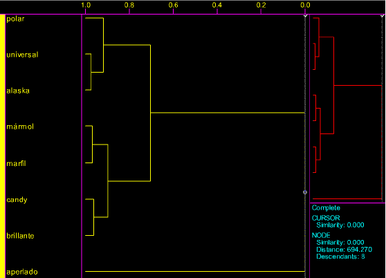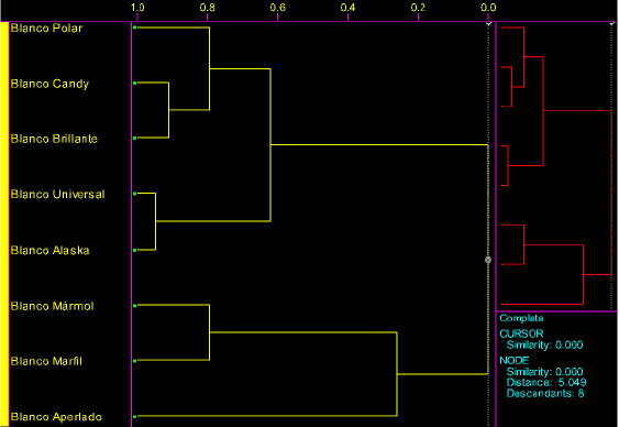 Posteriormente, se aplicó la técnica de Análisis Jerárquico para el estudio de los espectros de reflectancia difusa, utilizando la estrategia de asociación completa a partir de distancias euclidianas entre objetos. Los resultados de asociación se muestran en la Gráfica 4. Como puede apreciarse, la muestra de blanco aperlado no se asoció con el resto (grado de similitud de cero). La muestra de blanco polar de Volkswagen fue la segunda en discrepar en la serie, aunque con un grado de similitud significativo a la par de los blancos universal y Alaska (alrededor del 90 %). Por otro lado, se encontró gran similitud entre los siguientes pares de lacas: