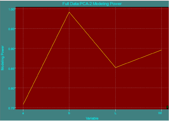 A partir de la distribución de los loadings o vectores de regresión en función del número de factores, pudo apreciarse que la variable b* fue determinante en la diferenciación de las muestras. Esta variable se asocia a la caracterización de los tonos amarillo y azul; valores de b+ indicaron una tendencia al amarillo, aunque en una escala mínima, pues sus valores fueron menores a diez en todos los casos, en una escala de 0 a 100. Se llegó a la misma conclusión sobre la importancia de b* para distinguir las lacas bajo estudio, a partir de la representación del poder de modelación en función de las variables de partida (Gráfica 6).