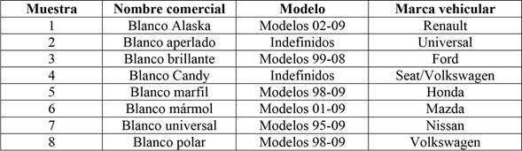 Las muestras analizadas se adquirieron en locales comerciales de la zona; su descripción se presenta en la Tabla 1. Las lacas acrílicas de tono blanco para retoque de pintura automotriz se depositaron como películas en portaobjetos, analizándose una vez que estuvieron secas.
