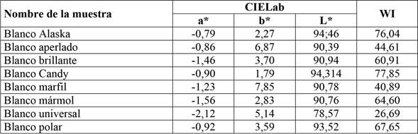 En la Tabla 2 pueden observarse las coordenadas cromáticas en CIELab y el índice de blancura de las muestras bajo estudio. En general, las muestras se encuentran en el mismo cuadrante: luminosidad significativa (L*~70), con una tendencia apenas perceptible hacia el verde (-a*) y amarillo (+b*); en ninguno de los casos se observan condiciones acromáticas (a* = 0, b* = 0). De acuerdo con estas tendencias, es evidente que se trata de blancos cálidos (con un ligero matiz de amarillo) y no blancos fríos (con ligero matiz de azul). Por otro lado, tales matices fueron apenas significativos, dado que todos se encontraron por debajo del 10, en una escala de 0 a 100.