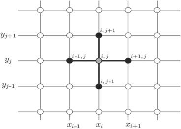 Con respecto al espacio, este esquema relaciona a cinco puntos de la malla para estimar tal y como se muestra en la Figura 1. Mientras que, con respecto al tiempo, se tiene una ecuación diferencial ordinaria, cuya solución será aproximada por medio del método de Euler implícito (ver, por ejemplo, Strikwerda (2004)). La razón de emplear un esquema implícito es para generar un método que sea incondicionalmente estable cuando se avanza en cada paso de tiempo. Es decir, no hay condición CFL (Courant-Friedrichs-Lewy) en este caso.