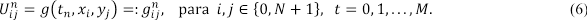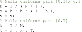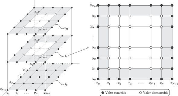 Donde , se conoce como el paso en tiempo. Seguidamente, dado un entero N > 0, se construye una malla cartesiana (o cuadrícula) uniforme para Ω, la cual consiste de