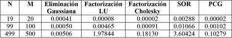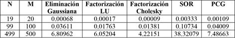 En la Tabla 1, se determina el total de memoria creada por las implementaciones, donde no es posible conocer con exactitud la requerida por Eliminación Gaussiana dado que no se puede acceder a la programación MATLAB® de este método. A pesar de ello, se aprecia, tal y como se esperaba, que los métodos iterativos son los que menos memoria requieren. Por ende, cuando la cantidad de incógnitas sea significativamente grande, los resultados en la Tabla 1 sugieren utilizar métodos iterativos, para así no requerir más memoria que la utilizada para almacenar el sistema lineal generado por el método de diferencias finitas. En la Tabla 2, se muestra el tiempo de ejecución que se requiere previo al recorrido de los pasos temporales. Este tiempo considera la construcción de la matriz , así como aquellos procesos que requieren los métodos de resolución, como, por ejemplo, la determinación de factorizaciones. Observe que Eliminación Gaussiana fue el que menos tiempo necesitó, dado que solo se requiere ensamblar el sistema lineal para su ejecución. En la Tabla 3, se muestra el tiempo de ejecución exclusivo de la iteración que recorre cada paso de tiempo, donde se resuelven los sistemas lineales. Este es el tiempo más considerable, dado que depende de la cantidad de puntos considerados para la aproximación de la solución. Luego, nótese de estos resultados, que el método más eficiente corresponde a la factorización de Cholesky, lo cual es consecuencia de que previo a esta iteración ya se realizaron procedimientos que agilizan la resolución de los sistemas lineales. Más aún, es interesante observar que Eliminación Gaussiana y PCG poseen tiempos similares, a pesar de que el primero se realiza en paralelo. Finalmente, en la Tabla 4, se resumen el tiempo total de ejecución, donde nuevamente se aprecia que resolver los sistemas lineales con la factorización de Cholesky resulta ser el procedimiento más veloz, al menos, para los tamaños de problemas considerados. A pesar de ello, es importante observar que el método PCG obtuvo un buen rendimiento, lo que sugiere que utilizar este método no solo no requiere gran capacidad memoria comparado con los otros, sino que además es veloz.