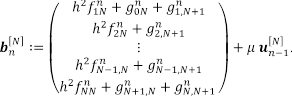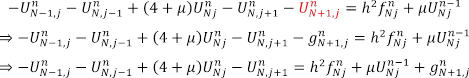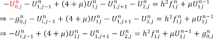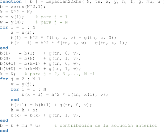 Donde x y y representan los vectores que almacenan la partición en el espacio, mientras que las funciones f y g, son implementaciones respectivas de la fuente y la información de borde