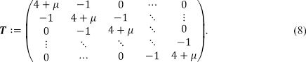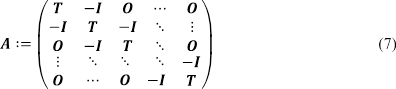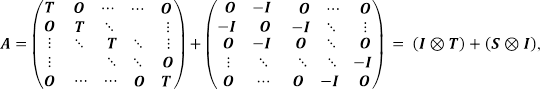 Es una matriz de tamaño con I la matriz identidad de orden N, O la matriz nula de orden N, y T una matriz tridiagonal de orden N, definida por